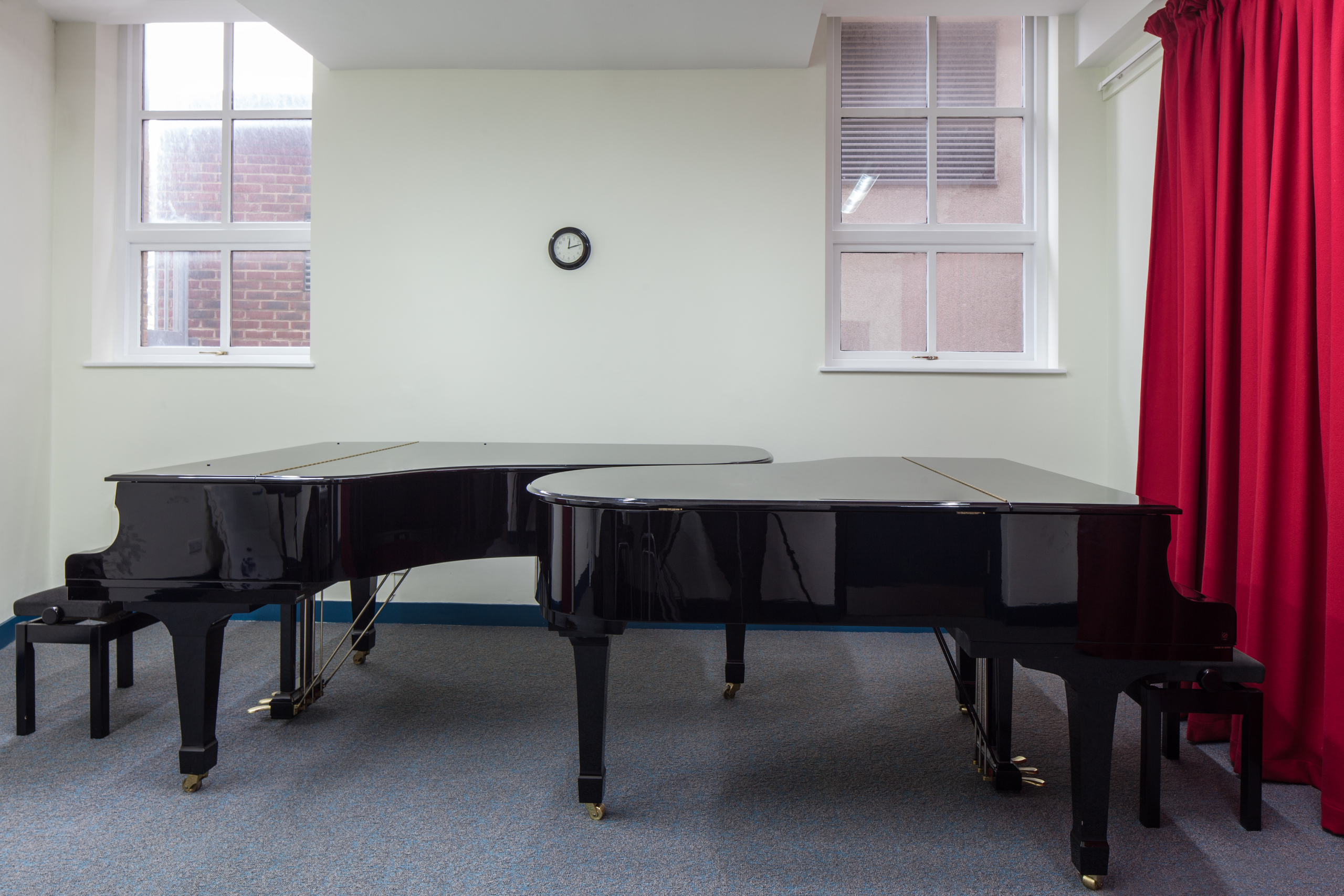 The Carne Studio is our largest practice room. It has two pianos and is ideal for small groups to rehearse, piano teaching, or individual practice.